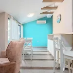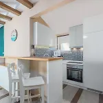 Blagovaonica apartmana, zajedno s potpuno opremljenom kuhinjom, omogućava gostima da uživaju u obrocima pripremljenim kod kuće s izvanrednim pogledom. Prisutnost električnog kuhalnika i raznih kuhinjskih pogodnosti dodaje udobnosti, omogućavajući udobno i intimno iskustvo blagovanja. Bilo da je to doručak s pogledom na vrt ili večera s pogledom na more, ambijent pojačava svaki obrok.
